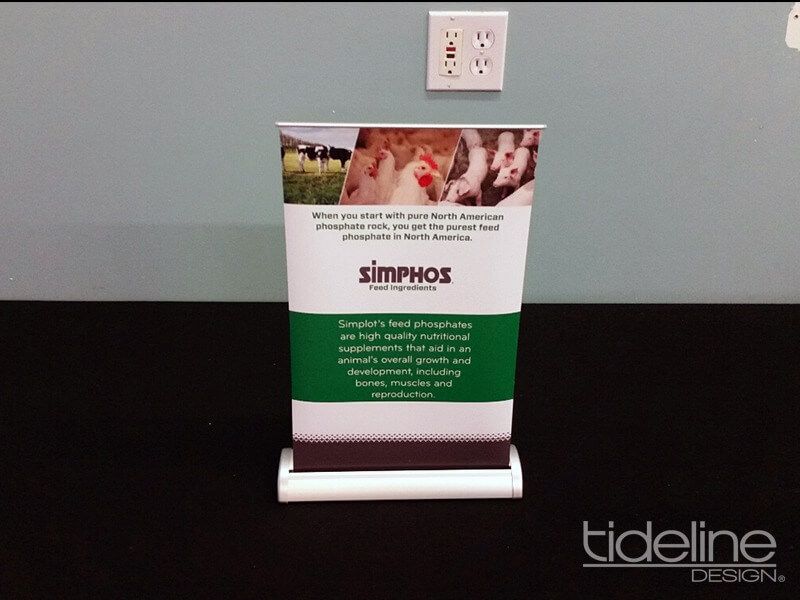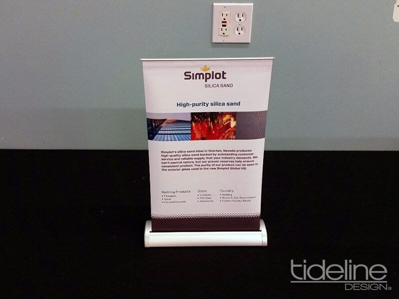 We’ve created several of these table-top displays for Simplot’s Human Resource department. They like the versatility, ease of setup, and the up-scale, yet unpretentious look of the Medallion tabletop.  The side splash of color was incorporated with the stand-off graphic placard.  We left it generic with the subtle word “careers” running up the side.  The grid pattern of the photos allowed us to stay within the new brand guidelines and represent the major business groups of the company. We added a iPad stand to one of them for job fairs where attendees can register for prizes and search available job openings.