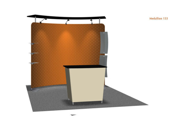 Medallion is a tension fabric portable display system. It was designed for simplicity and value. The Medallion exhibit system is a lightweight, convenient, portable display system with multiple design possibilities. Its compact aluminum tube frame structure assembles quickly without requiring the use of tools. Uniquely attractive, washable, seamless tension fabric pillowcase graphics slip effortlessly over the frame. There are a host of very affordable and very unique, pre-packaged designs available. The system can be customized to fit your individual trade show exhibiting needs.